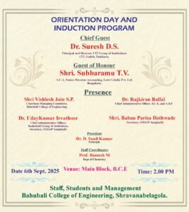 The Orientation Day and Induction Program for the staff, students, and management of Bahubali College of Engineering (BCE) was conducted to mark the beginning of a new academic journey filled with learning, inspiration, and growth.